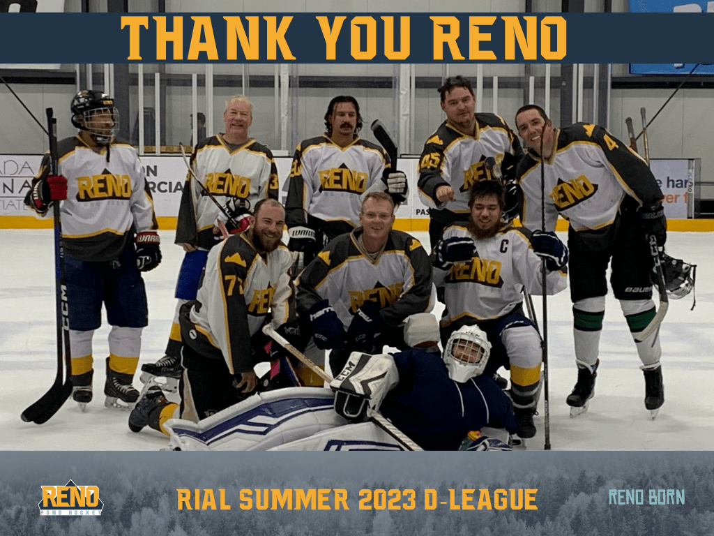 Reno Pond Hockey went undefeated during the RIAL Spring 2023 D-League season. They finished the regular season with a record of 10-0-0. They won the RIAL Spring 2023 D-League regular season title and would go on to win the RIAL Spring 2023 D-League Championship. Reno Pond Hockey did win back to back RIAL D-League Championships. They also had a 23 game winning streak to finish the season.