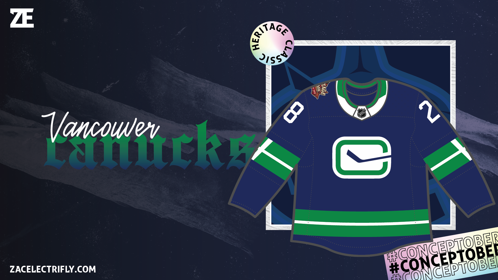 The Vancouver Canucks jersey for this concept is blue, green, and white. It is based on their 1970 away jersey. On the front is their C hockey stick logo. It is a modern version of their logo used in the 1970s. On the shoulder is the event logo.