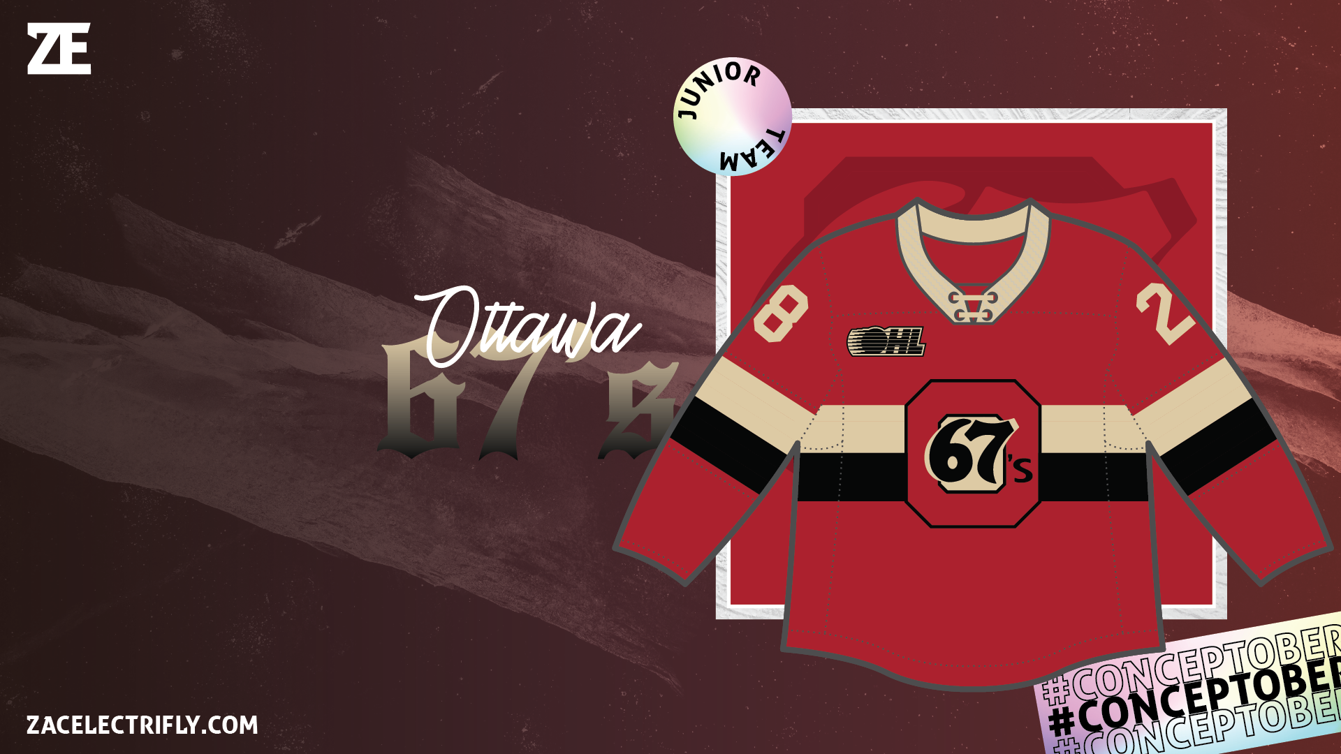 The Ottawa 67’s jersey is red, tan, and black. It is inspired by their current home jerseys, the Ottawa Senators 1917 to 1930 hockey jerseys, the Ottawa Senators 2011 to 2017 alternate jersey, the Ottawa Senators 2018 to 2020 NHL 100 Classic alternate jersey, and the Ottawa Senators 2014 Heritage Classic jersey. On the front it their primary logo. I did use the CCM Quicklite template from my AHL Concept Series as the CHL and AHL both use the CCM Quicklite jerseys.