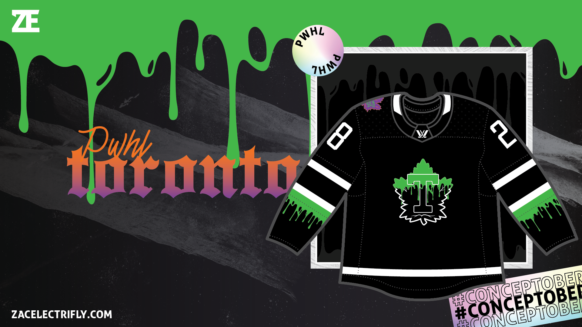 What I came up with for the PWHL Toronto Holloween jersey is the jersey based on the concept I did in the previous post. I changed the color of the jersey from blue and white to black and white and green. I also added some slime details to the sleeves and logo. I added a recolored version of the Toronto Maple Leafs logo on the shoulder too.