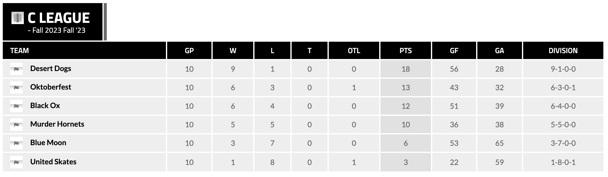In the C-League, the Desert Dogs, Oktoberfest, and Black Ox secured playoff spots. The Murder Hornets have advanced to the playoffs as well. Blue Moon and the United Skates have been eliminated from playoff contention.