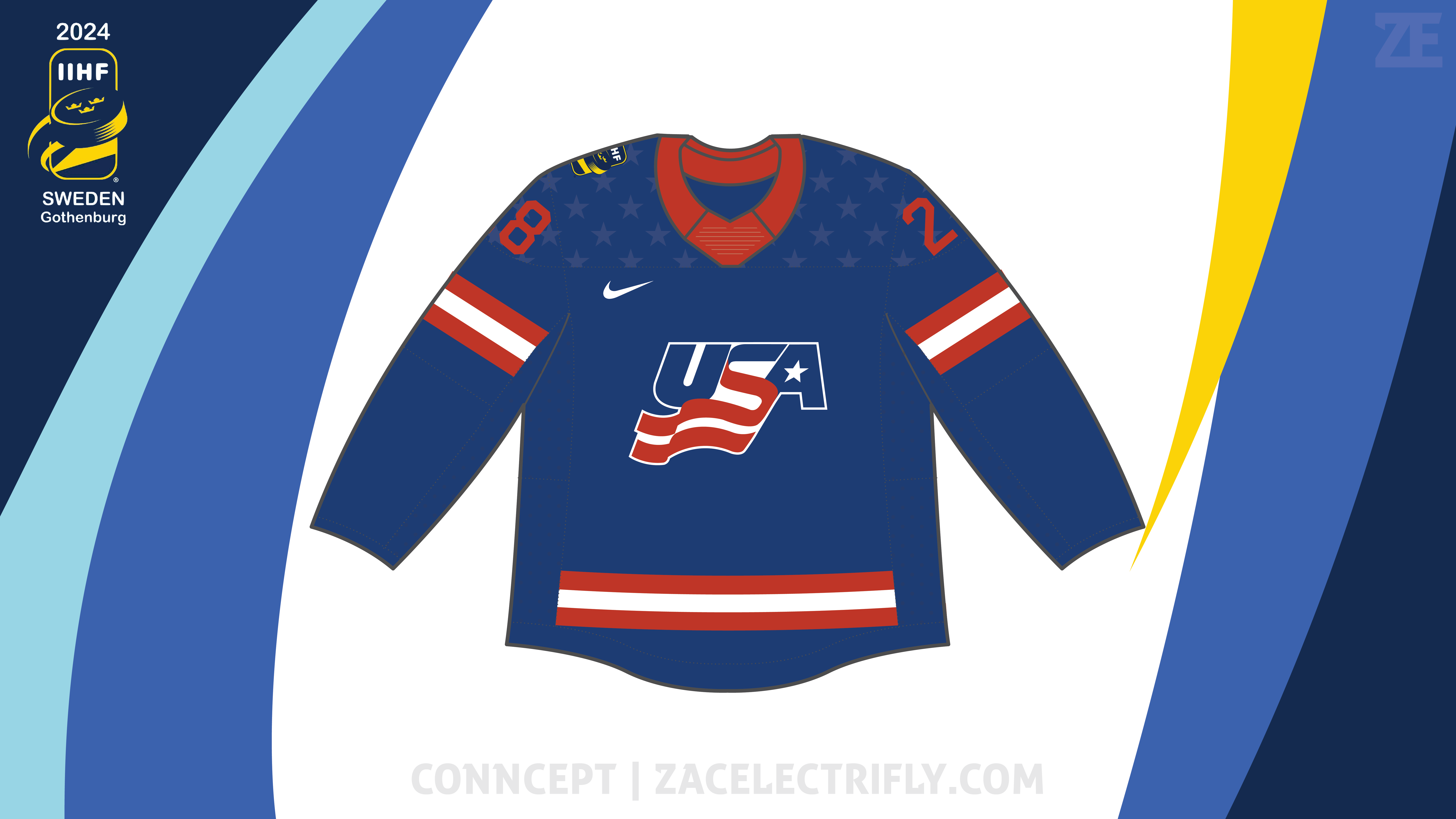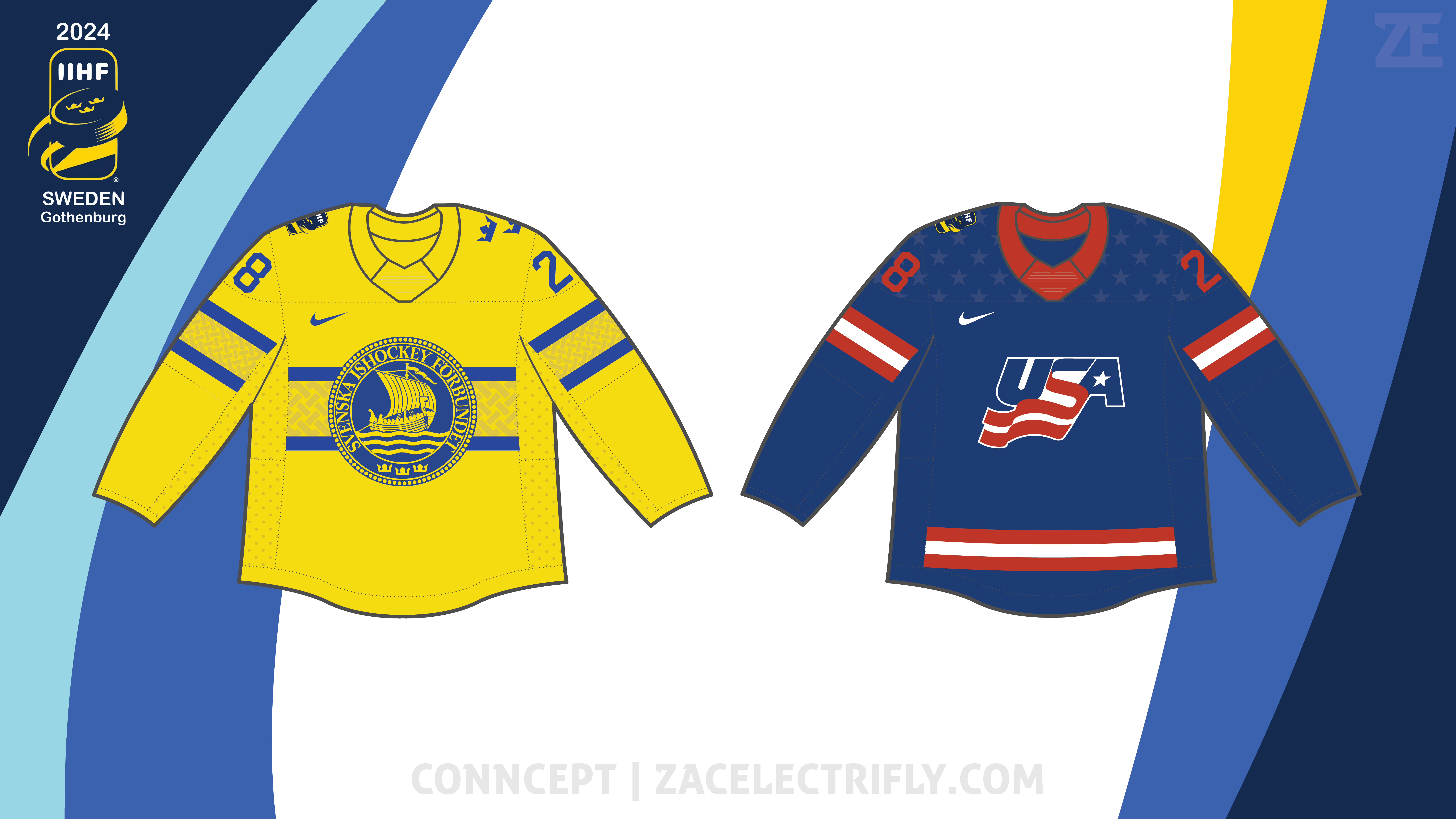 The International Ice Hockey Federation Wold Junior Championship was earlier this month. The final was between the United States and Sweden. The United States won their sixth World Juniors gold at this tournament. I wanted to do a concept for the tournament final. So I did jersey concepts for the United States and Sweden. The final was one game so I did one jersey concept for each team. If enough people like this concept I might do more concepts for other IIHF events.