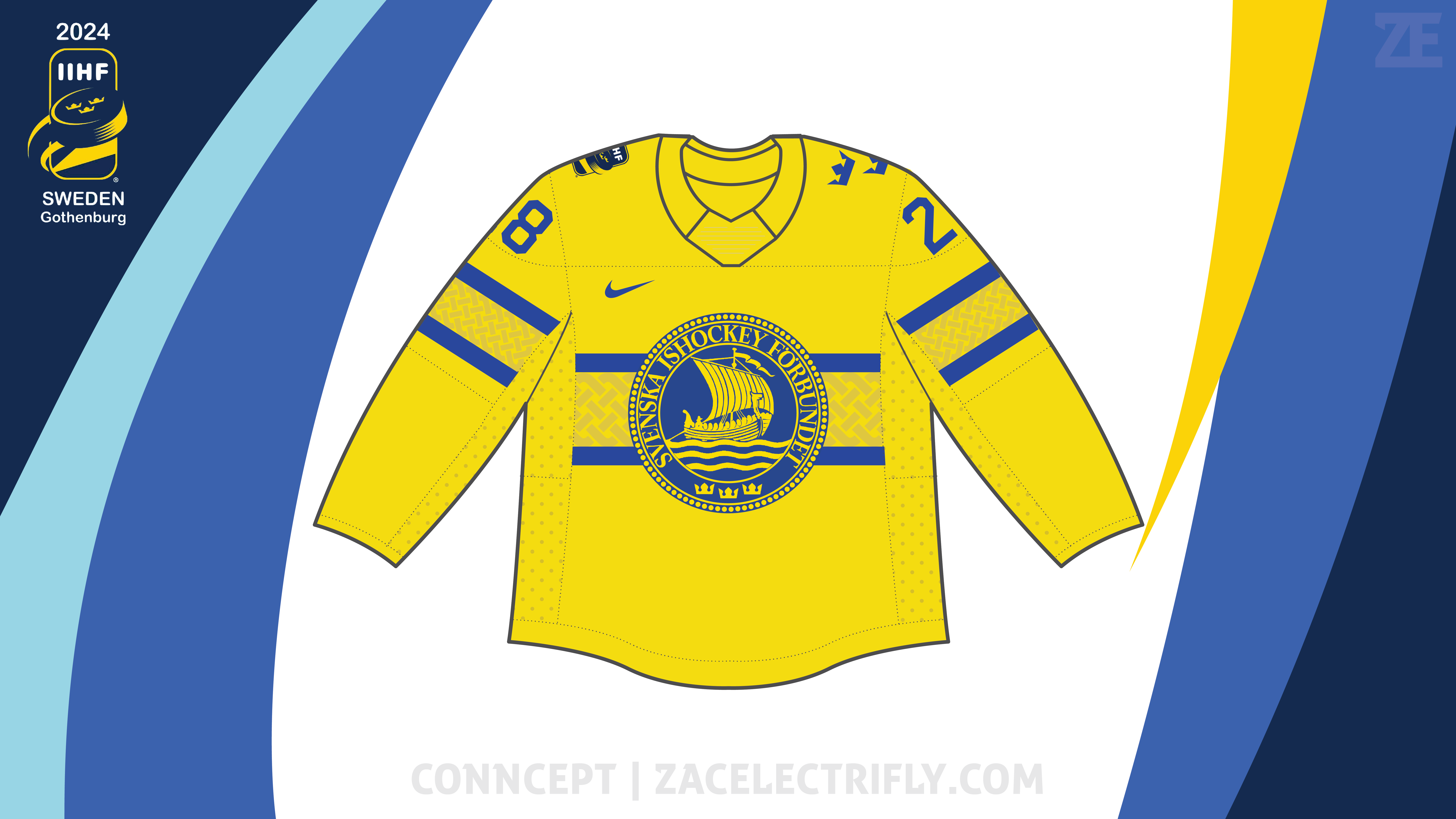For this concept the IIHF event logos would go on the right shoulder of every jersey at every IIHF event outside of the olympics. Also for this concept I used the Nike template I have used in my Qatar 2022 x Ice Hockey concept and my FIFA Women’s World Cup x Ice Hockey concept. The IIHF is sponsored by Nike. All teams in the top division use Nike jerseys. The Swedish Ice Hockey Association jersey is yellow and blue. The pattern on the jersey is inspired by viking patterns. On the front is there primary logo. On the shoulders is the event logo and the three crowns logo.