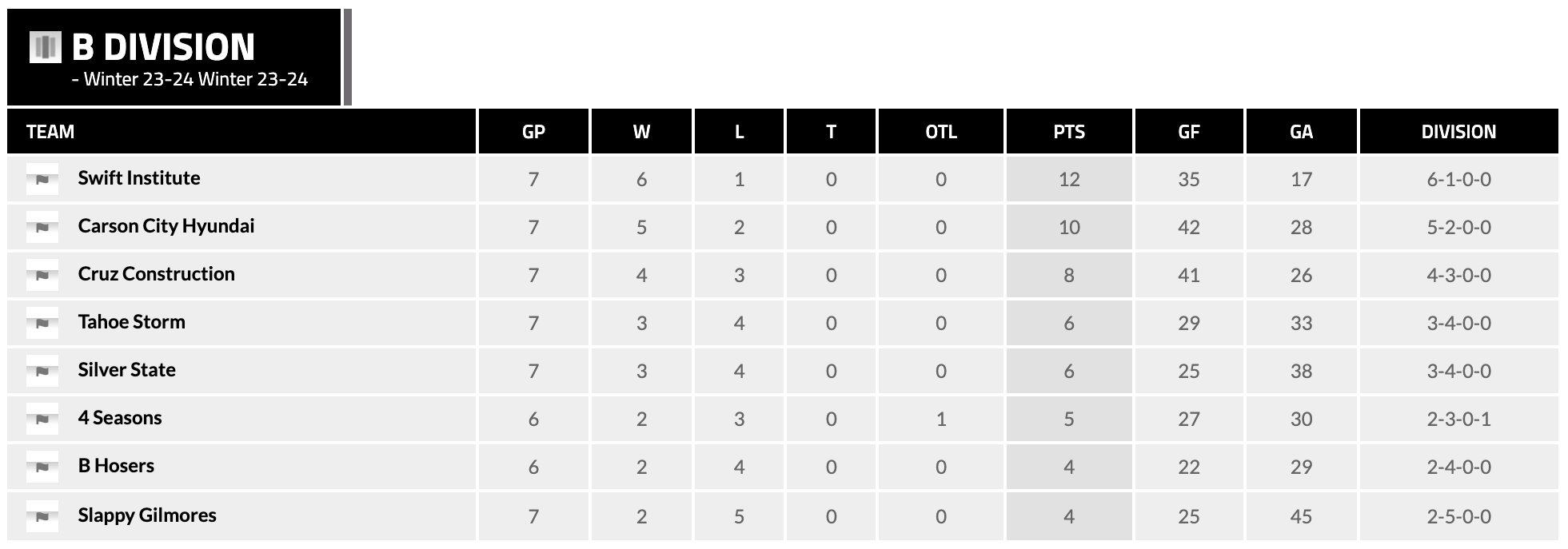 The Reno Ice Adult League Winter 2023-24 season is in week ten. The power rankings in this post are based on the games played between January 22nd and January 28th. Fourteen teams participated in ten games in week nine. Seven teams did not play in week nine. Nine of the twenty one teams moved. Two teams still remain undefeated as of writing this. There is still one team without a win as of writing this. There was two shutouts in week nine. Both of them came in the D-League There was no shootouts in week nine.