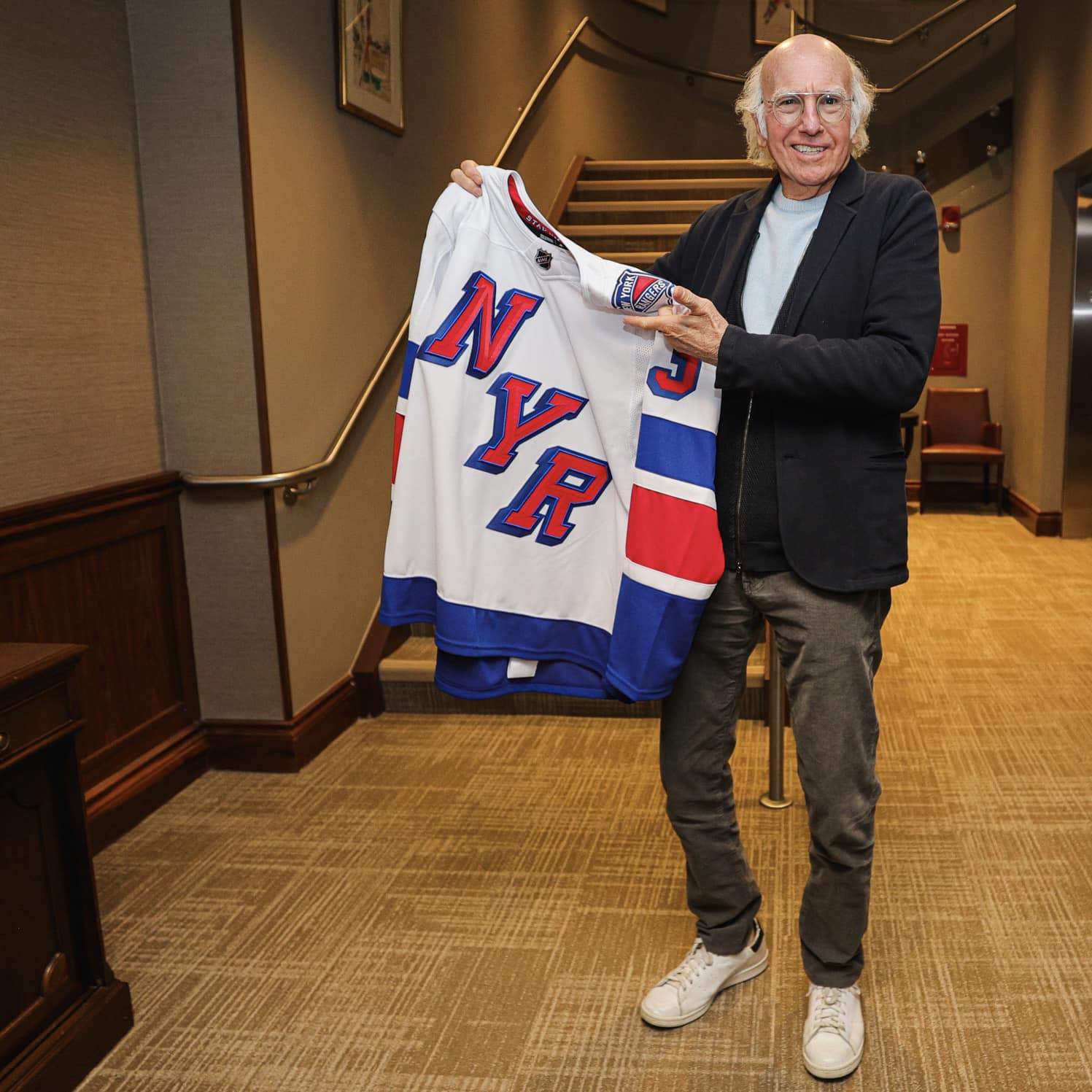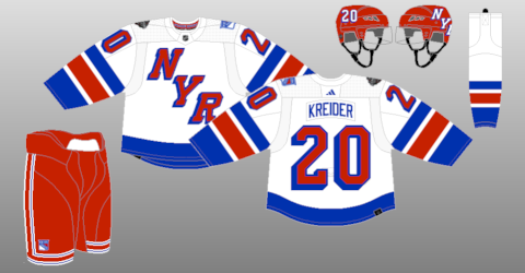 The New York Rangers 2024 NHL Stadium Series jersey is white, blue, and red. On the front is NYR. On the shoulders are the Rangers primary logo and the event logo. I really like this one. I am surprised that the Rangers had not tried to do something like this before.