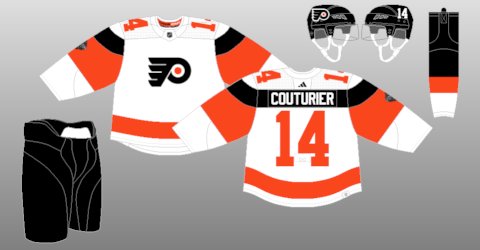 The Philadelphia Flyers jersey is white, orange, and black. It is easily one of the ugliest jerseys I have ever seen. On the front is their primary logo. On the shoulders are the numbers. Where this jersey falls apart is the sleeves. The sleeves look odd. The black part also stretches around the back which I am not a fan of.