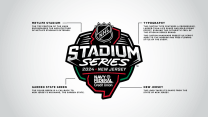 The logo for the 2024 NHL Stadium series incorporates the stadium the state of New Jersey. The logo is in the New Jersey Devils colors. It is a pretty standard stadium series logo.