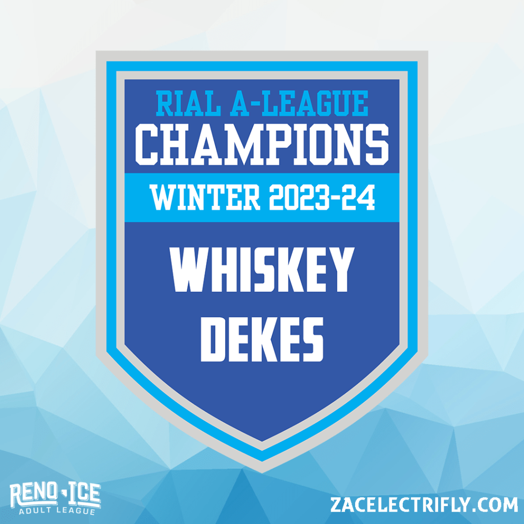 Whiskey Dekes are the RIAL Winter 2023-24 A-League Champions. This is the first time Whiskey Dekes have won the A-League Championship. They beat the Mustangs 6-3 in the RIAL Winter 2023-24 A-League Championship game.