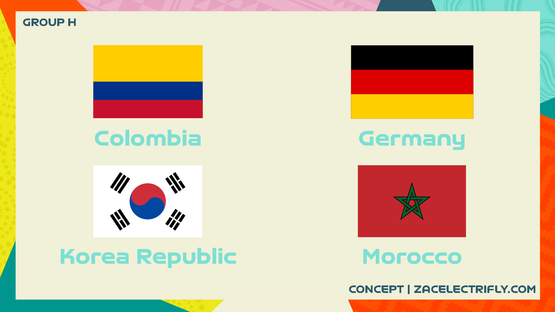 Here is what Group H looks like. My favorite here is the white Germany jersey. I really do like the pattern on the red Morocco jersey. #1 ranked is Germany. #2 Ranked is Morocco. #3 Ranked is Colombia. #4 Ranked is the Korea Republic. The red and pink was not a good look for the Korea Republic.