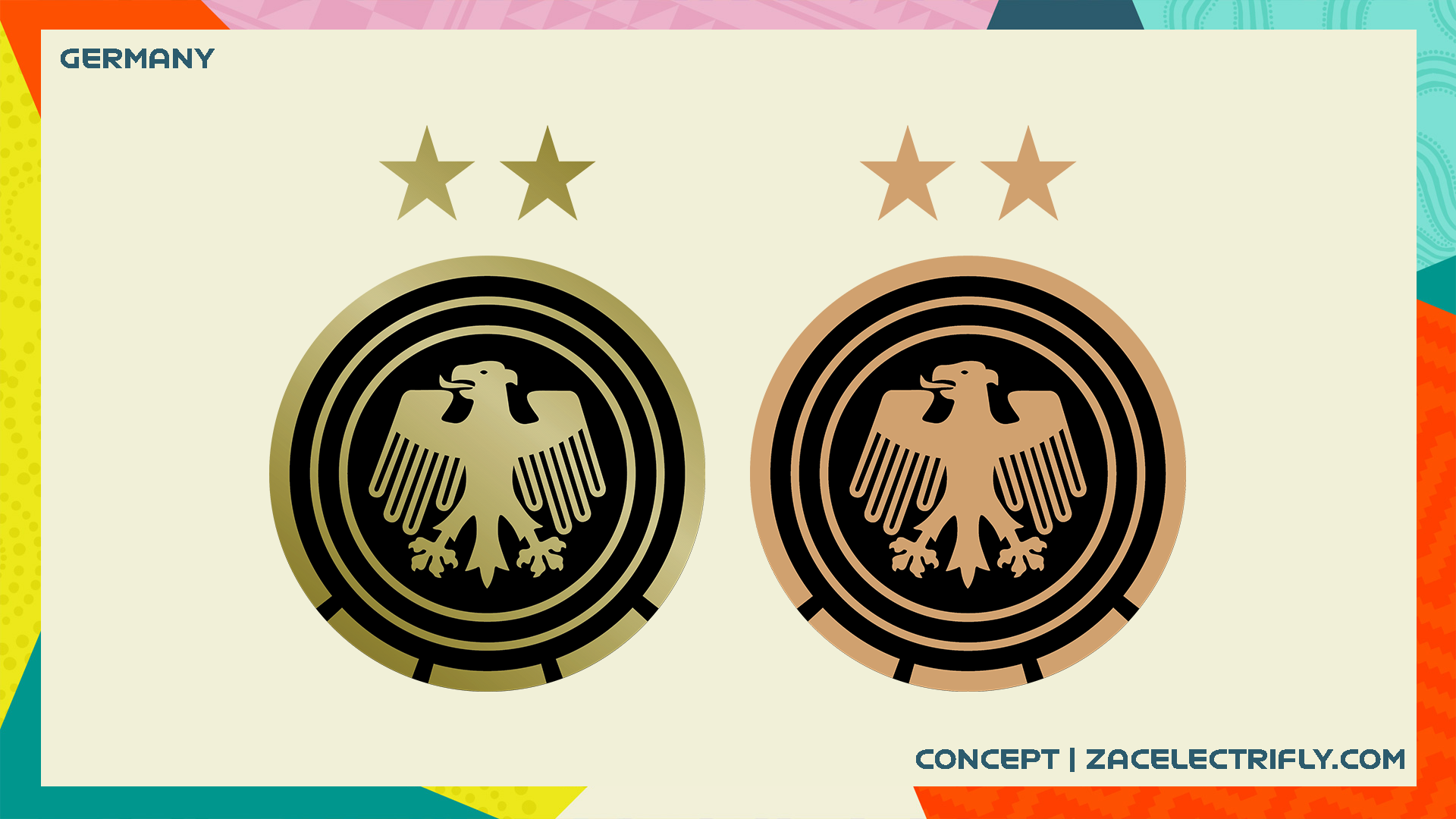 Germany are sponsored by Adidas. Their colors are black and gold. They also added bronze, turquoise, teal, and green for this competition. I did modify their logo. I removed the text. I made other elements of the logo larger. They have a white jersey and a teal jersey. The white jersey was used in the 2022 World Cup. T^he pattern on the teal jersey is inspired by the pattern on their soccer jersey. Both jerseys have the German flag on the collar.
