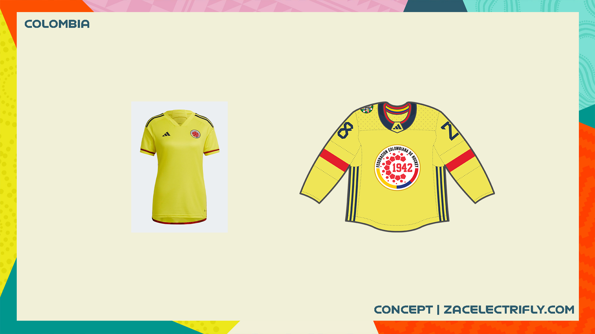 Colombia are sponsored by Adidas. Their colors are blue, red, yellow, gold, and black. I did modify their logo. I replaced the soccer ball with a stylized C and 1942 for when their soccer federation was founded. They have a yellow jersey and a dark blue jersey. They did use their yellow jersey in 2022. The dark blue jersey has an abstract pattern on it inspired by the pattern seen on their soccer jersey. On the collar is the Colombia flag.
