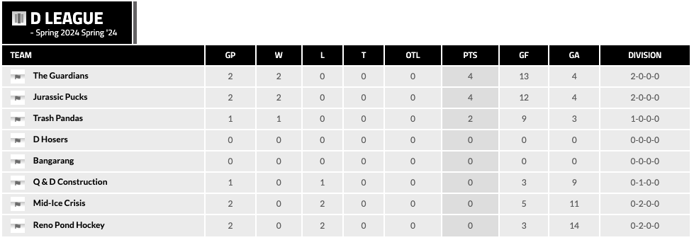 Bangarang continue to lead the D-League power rankings. They won their first game of the season. The Trash Pandas are in the second spot in the power rankings. They moved up after a win. Q & D Construction are in the third sport in the power rankings. They moved down after a loss. The Guardians stayed in the fourth spot. They did not play in week two. The Jurassic Pucks moved up after a win. The Reno Fire Hosers D moved down after a loss. Mid-Ice Crisis stayed in the seventh spot after a loss. Reno Pond Hockey stayed in last in the power rankings after not playing in week eight.