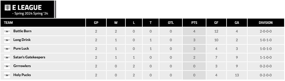 Long Drink continue to lead the E-League power rankings. They won their week two game. Battle Born stayed in the second spot after a win. Satan’s Gatekeepers stayed in the third spot after not playing in week two. Pure Luck stayed in the fourth spot after a loss in week two. The Grrrowlers stayed in the fifth spot after a loss. The Holy Pucks stayed in the last spot in the power rankings after not playing in week two.