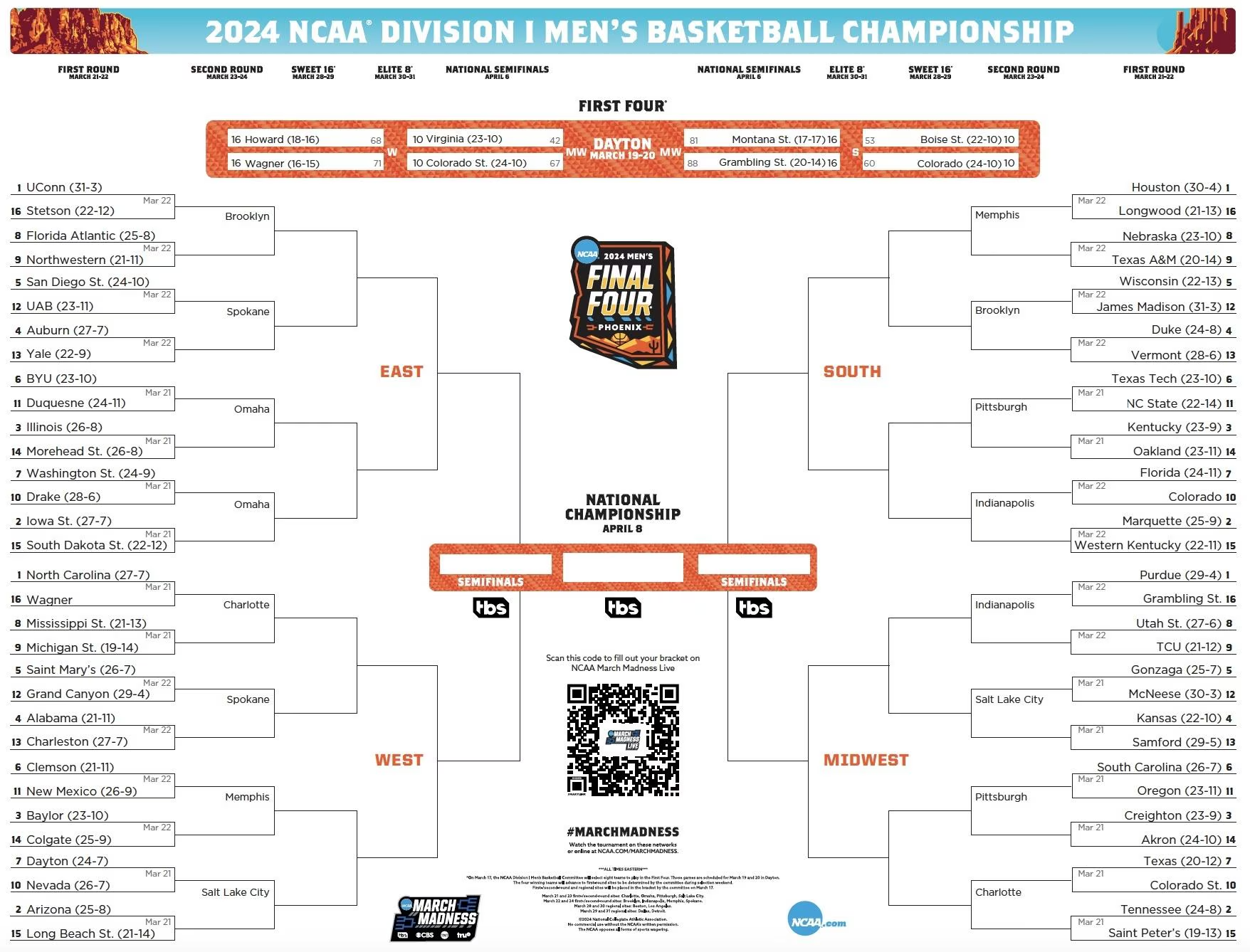 Yesterday was the second day of March Madness. The last two First Four games were played yesterday. #16 Grambling played #16 Montana State. #10 Colorado played #10 Boise State. The First Round of March Madness starts Today. There are sixteen games scheduled for today. It all starts at 9:15 am PST. #9 Michigan State will play #8 Mississippi State. #11 Duquesne will play #6 BYU. #14 Akron will play #3 Creighton. #15 Long Beach will play #2 Arizona. #16 Wagner will play #1 North Carolina. #14 Morehead State will play #3 Illinois. #11 Oregon will play #6 South Carolina. #10 Nevada will play #7 Dayton. #10 Colorado State will play #7 Texas. #14 Oakland will play #3 Kentucky. #12 McNeese will play #5 Gonzaga. #15 South Dakota State will play #2 Iowa State. #15 Saint Peter’s will play #2 Tennessee. #11 NC State will play #6 Texas Tech. #13 Samford will play #4 Kansas. #10 Drake will play #7 Washington State.