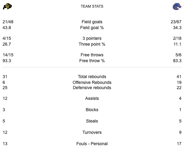 Colorado had a two point lead at halftime. Boise State had a two point lead with around five minutes to go. It was a three point game with 36 seconds to go. In those last 36 seconds Colorado was able to get a seven point lead. The final score was 60-53 Colorado. Boise State fell apart in the last minute of the game. Colorado got up and Boise couldn’t catch up. #10 Colorado advances and will play #7 Florida.