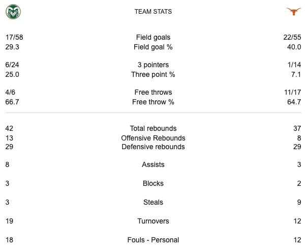 Texas had a sixteen point lead at halftime. The score was 27-11 Texas. With around five minutes left in the game Texas had a seven point lead. Around a minute to go Texas had a twelve point lead. Texas held on to win 56-44. Colorado State had a disappointing first half with a lack of offense. Colorado State did outscore Texas in the second half. The deficit was too much for Colorado State. After this game the Mountain West Conference teams have failed to win a game yet outside of the First Four. Texas has advanced to the Second Round. After this game Texas was going to play the winner of the #2 Tennessee and #15 Saint Peter’s game in the Second Round.