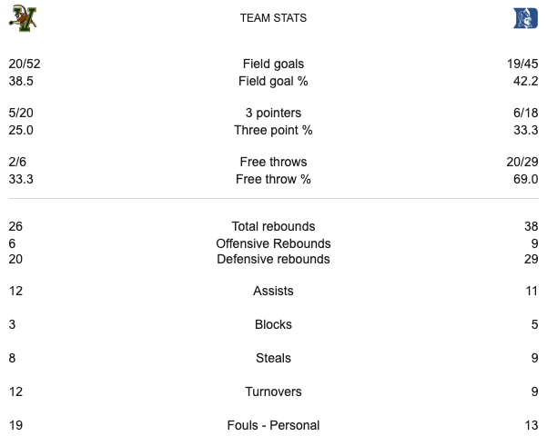 #13 Vermont vs #4 Duke – Duke had a five point lead at halftime. The score was 34-29 Duke. With five minutes to go Duke had a nine point lead. With under two minutes to go Duke had a fifteen point lead. Duke won the game 64-47 and advanced to the Second Round. After this game Duke was waiting to see if they would play #5 Wisconsin or #12 James Madison.