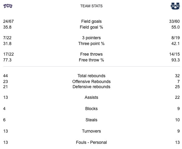 #9 TCU vs #8 Utah State – Utah state had a six point lead at halftime. The score was 42-37 Utah state. With five minutes to go Utah State had a sixteen point lead. With just over two minutes to go Utah state had a sixteen point lead. Utah won the game 88-72 in what turned out to be a dominate win. This was the best win for the Mountain West Conference so far. Utah State advanced to the Second Round and has eliminated TCU. #8 Utah State will play #1 Purdue in what will be the biggest test for the Mountain West this season.