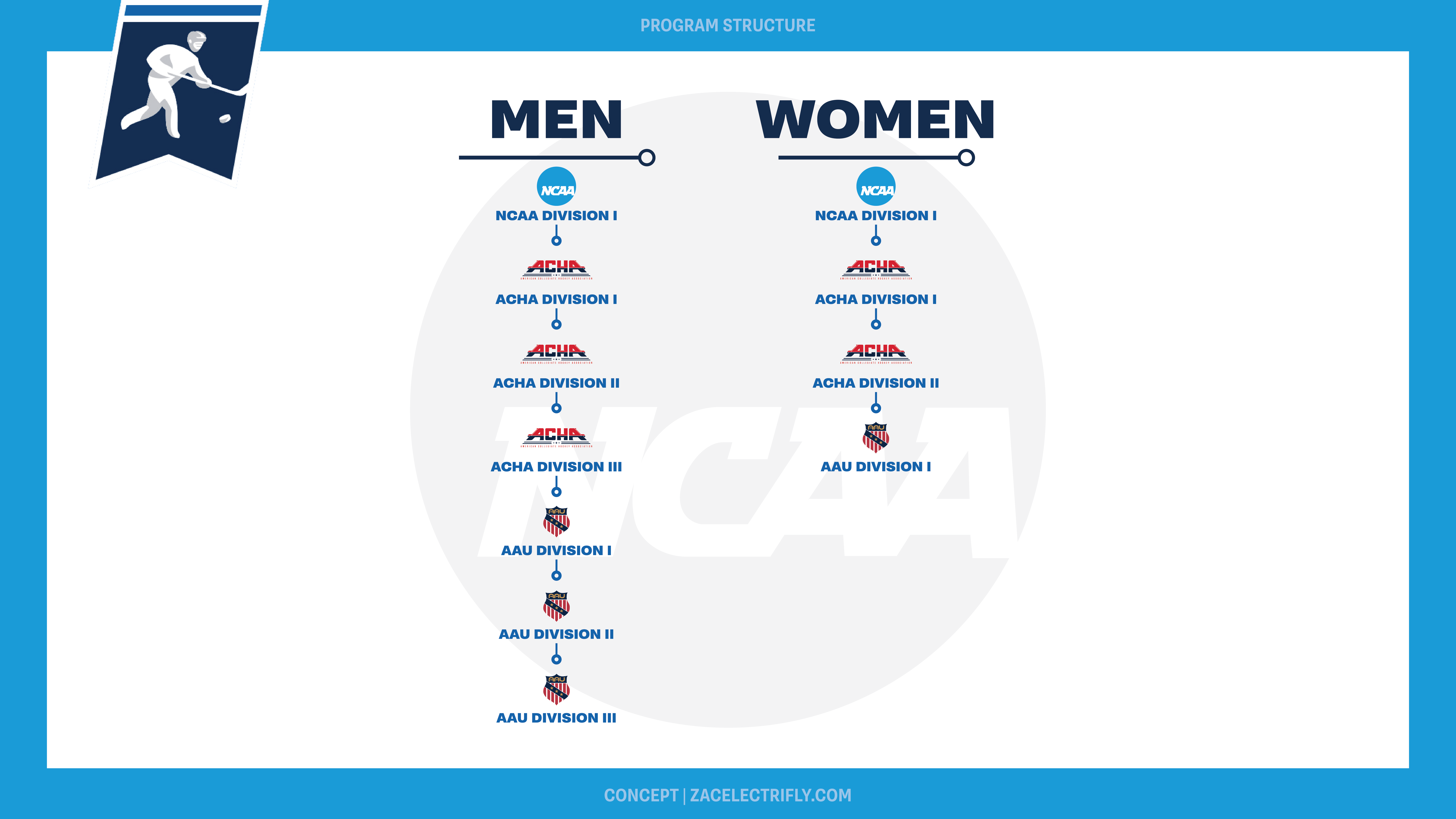 For this concept, in the United States there are three college hockey leagues. The NCAA is the top league. The American Collegiate Hockey Association is the second league. The Amateur Athletic Union also has a league. For this concept each program has a men’s and women’s structure. The men’s structure is the NCAA division one, the ACHA division one, the ACHA division two, the ACHA division three, the AAU division one, the AAU division two, and the AAU division three. The women’s structure is NCAA division one, the ACHA division one, the ACHA division two, the AAU division one. Additionally programs will have teams in conference or regional leagues, local leagues or their own leagues. NCAA ice hockey programs would not be permitted to own professional teams, have teams that compete in junior leagues, or have travel and high school hockey teams. ACHA and AAU teams can also be from the NCAA division two, the NCAA division three, or from outside of the NCAA.