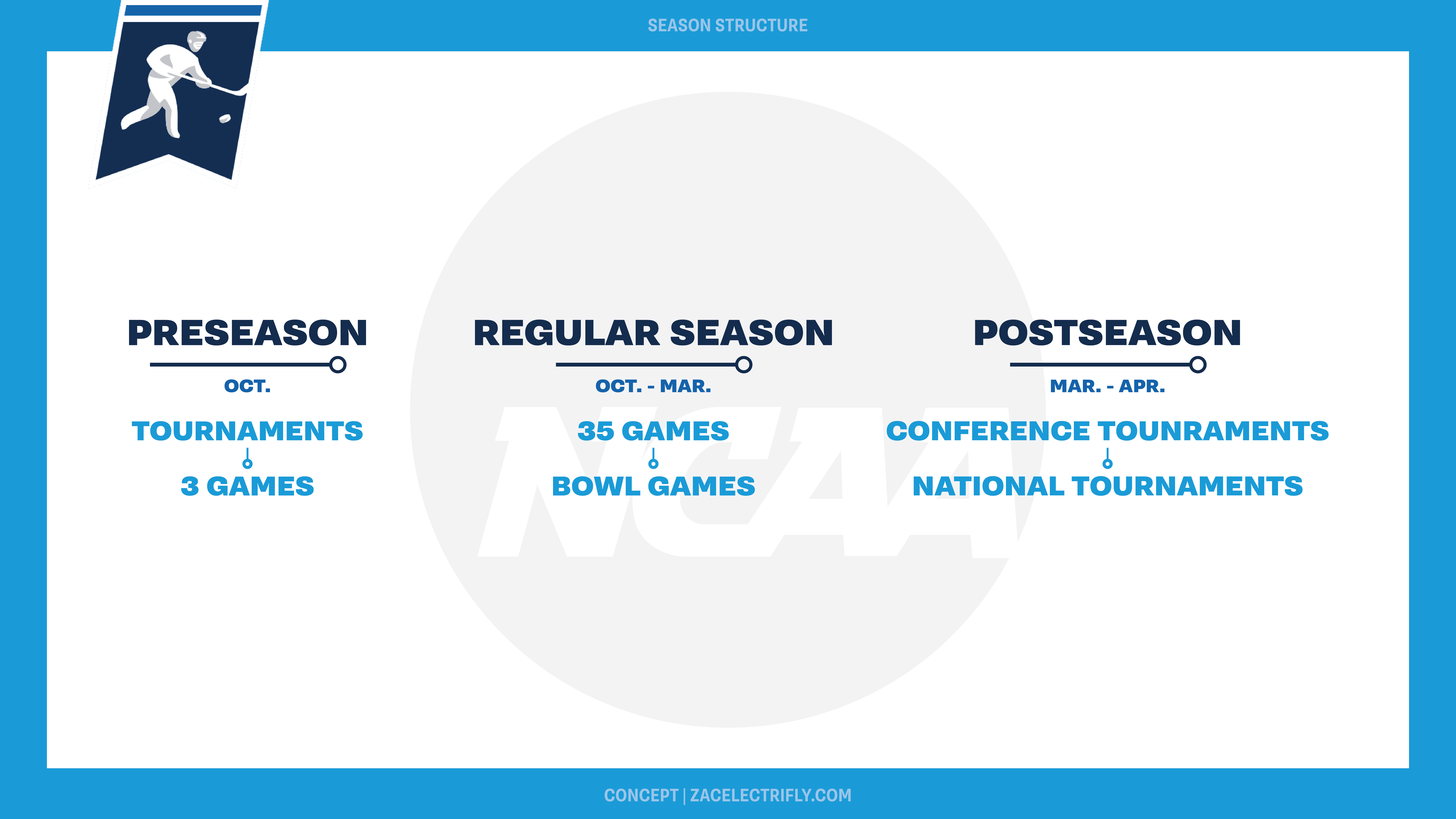 For this concept the season will be broken down into three parts. The first part is the preseason. The second part is the regular season. The third part is the postseason. Games are split into conference and non-conference games. Conference games are played by two teams who are in the same conference. Non-conference games are played by two teams who are not in the same conference. Conference games only effect the conference standings. Non-conference games effect the overall NCAA standings. During the preseason teams participate in tournaments followed by up to three preseason games. Teams are allowed to play up to thirty five regular season games. Teams have to play each team in their conference at least once at home and once away. As part of the regular season teams play in bowl games which are outdoor hockey games that count as regular season games. The postseason consists of conference tournaments and national tournaments.