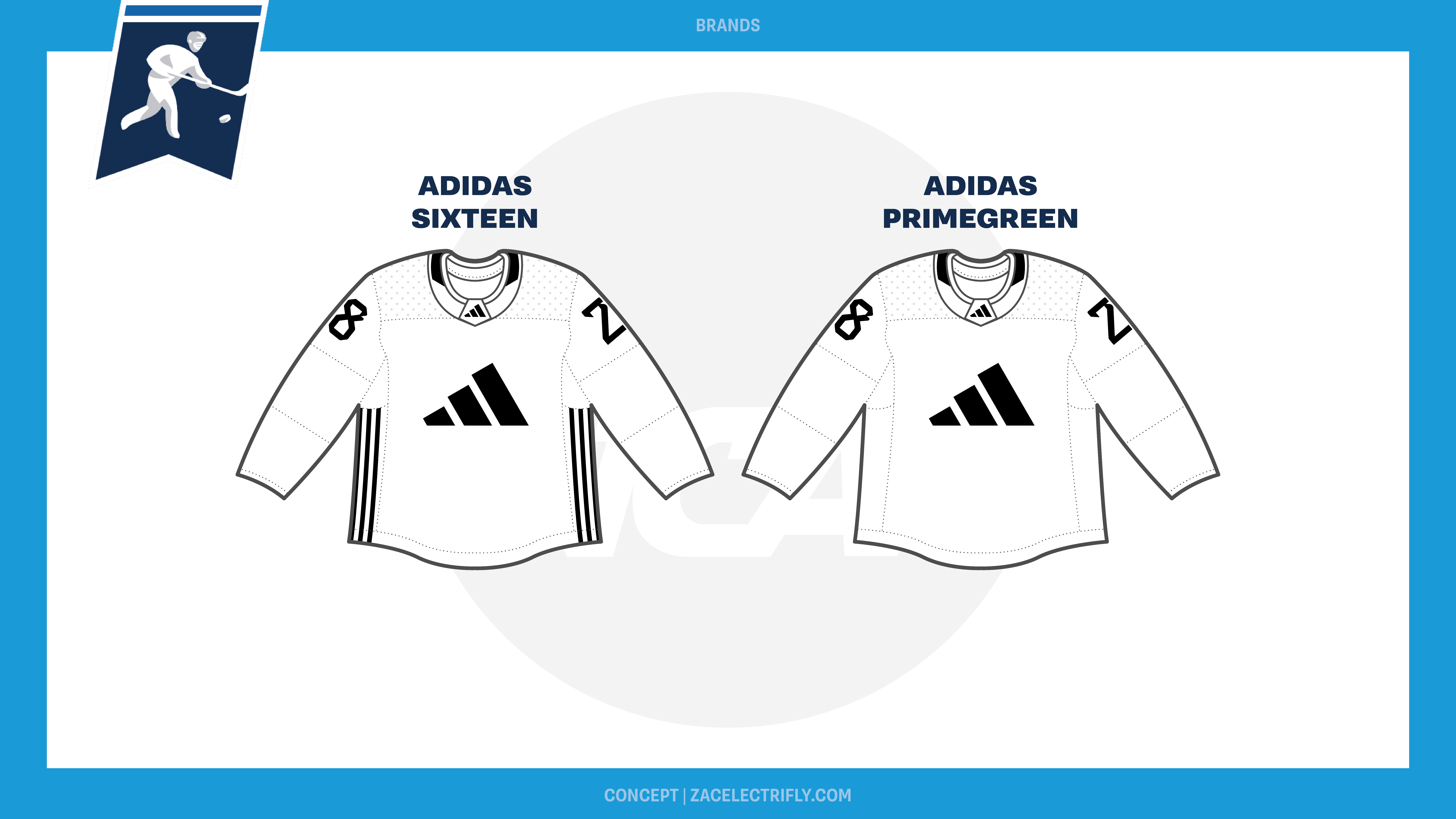 Adidas has two templates. Their first template is the Sixteen template which is based on the 2016 World Cup Of Hockey jerseys. The second Adidas template is the Primegreen template. That template is based on the current NHL jerseys. All of the current Adidas sponsored NCAA division one ice hockey teams and football teams that switched over to the latest Adidas template use the primegreen jerseys. All of the Adidas sponsored teams outside of the NCAA division one ice hockey that use the old Adidas football template or do not have a football program use the Sixteen template. In this concept all Adidas sponsored hockey teams used the Sixteen template prior to the 2019-20 season and since then would have been given the option for one of the other. Adidas teams will use CCM as their equipment provider. While CCM is no longer owned by Adidas, they still have a strong relationship for this concept.