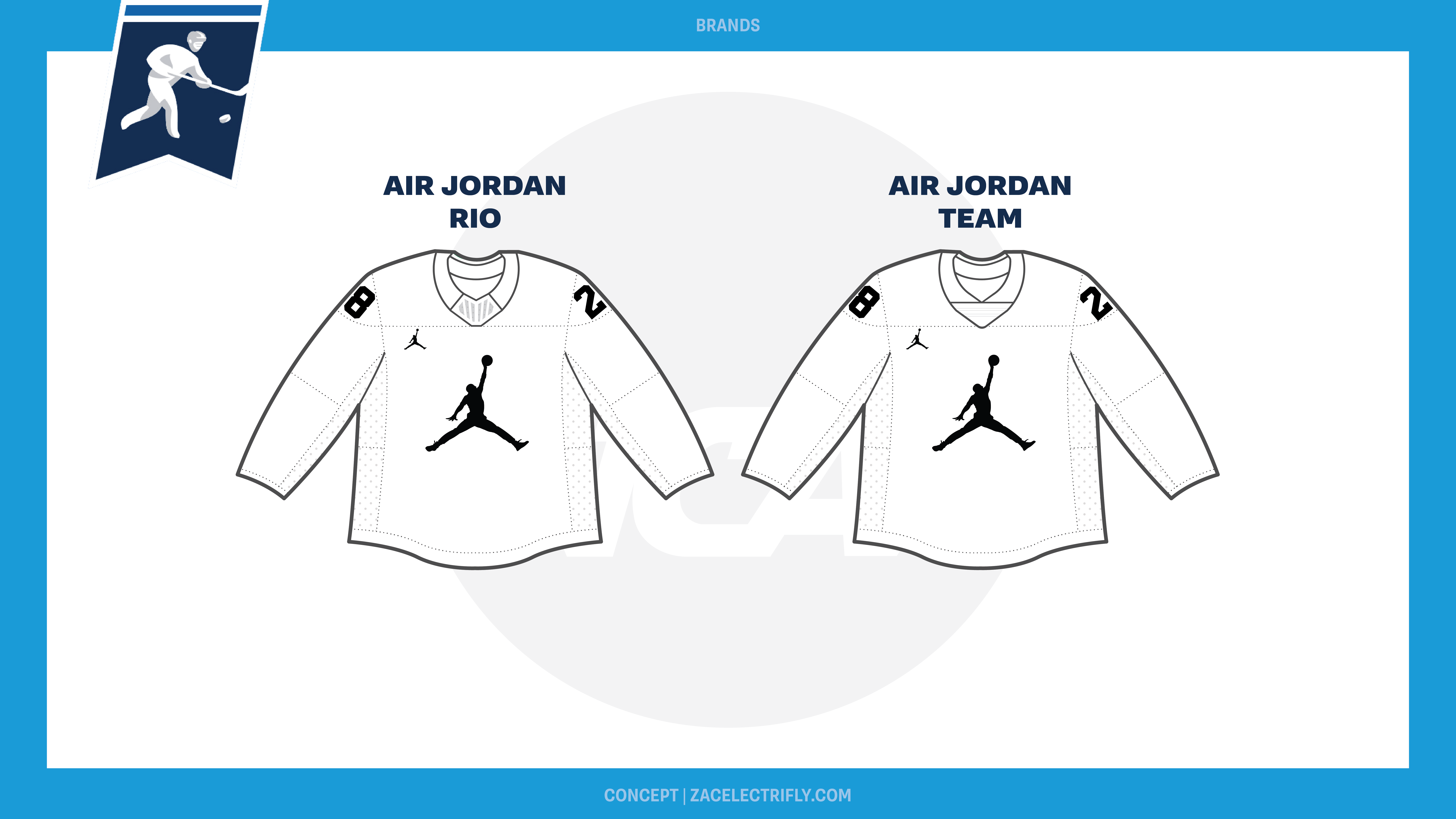 Air Jordan has two templates. The Jordan Rio and Jordan Team. Both templates are Nike templates with the Air Jordan logo. Only teams sponsored by Air Jordan use either of the templates. Teams with the latest football template use the Jordan Rio template. Teams with an older template use the Jordan Team template. Air Jordan teams would use Bauer equipment due to both companies relationship with Nike.