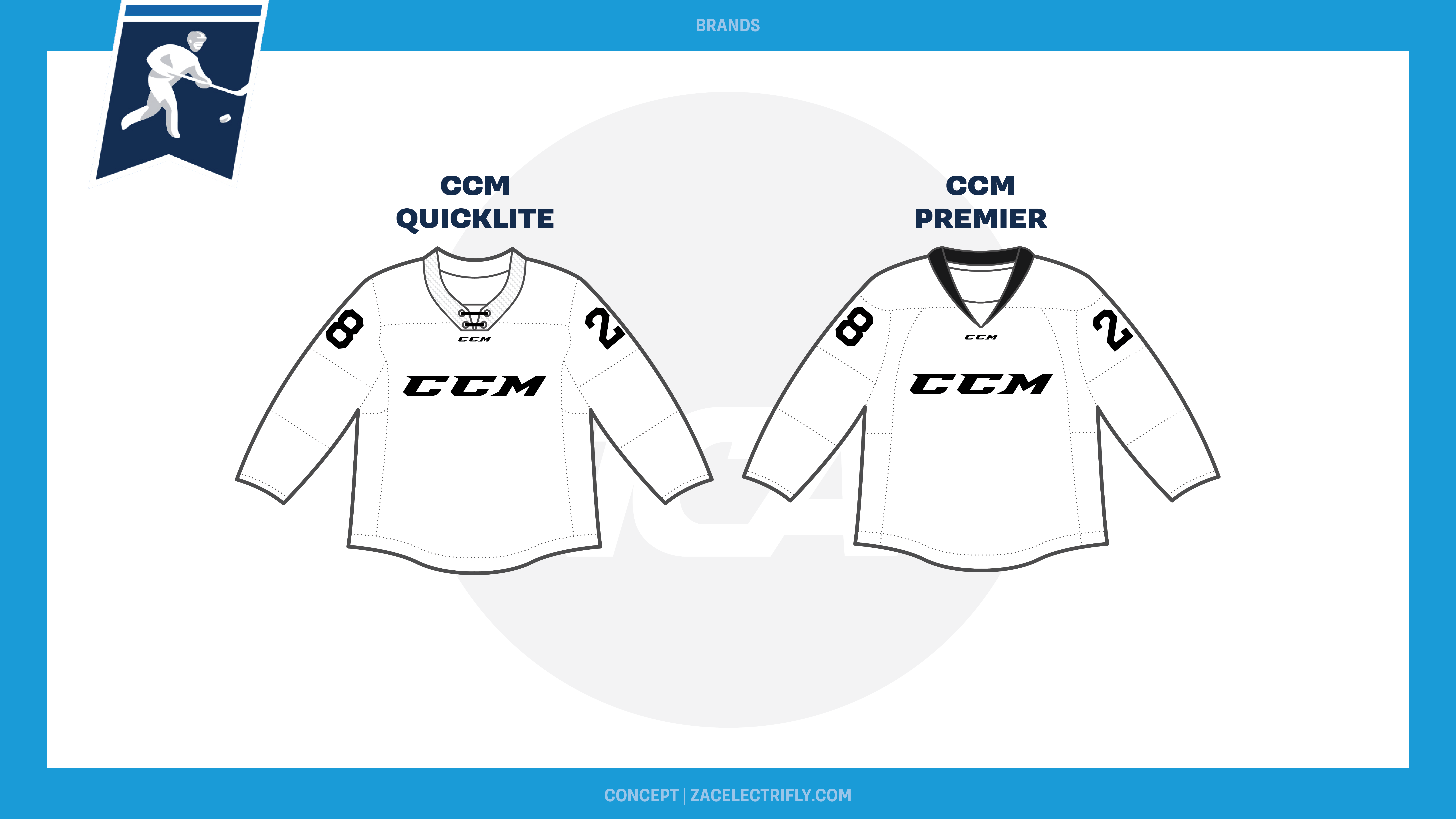 CCM has two templates. The CCM Quicklite template is based on the jerseys seen in the American Hockey League and Canadian Hockey League. The CCM Premier template is based on the NHL jerseys from 2008 to 2016. CCM Jerseys will be used by current NCAA division one hockey teams that use CCM jerseys. CCM teams will also use CCM equipment.