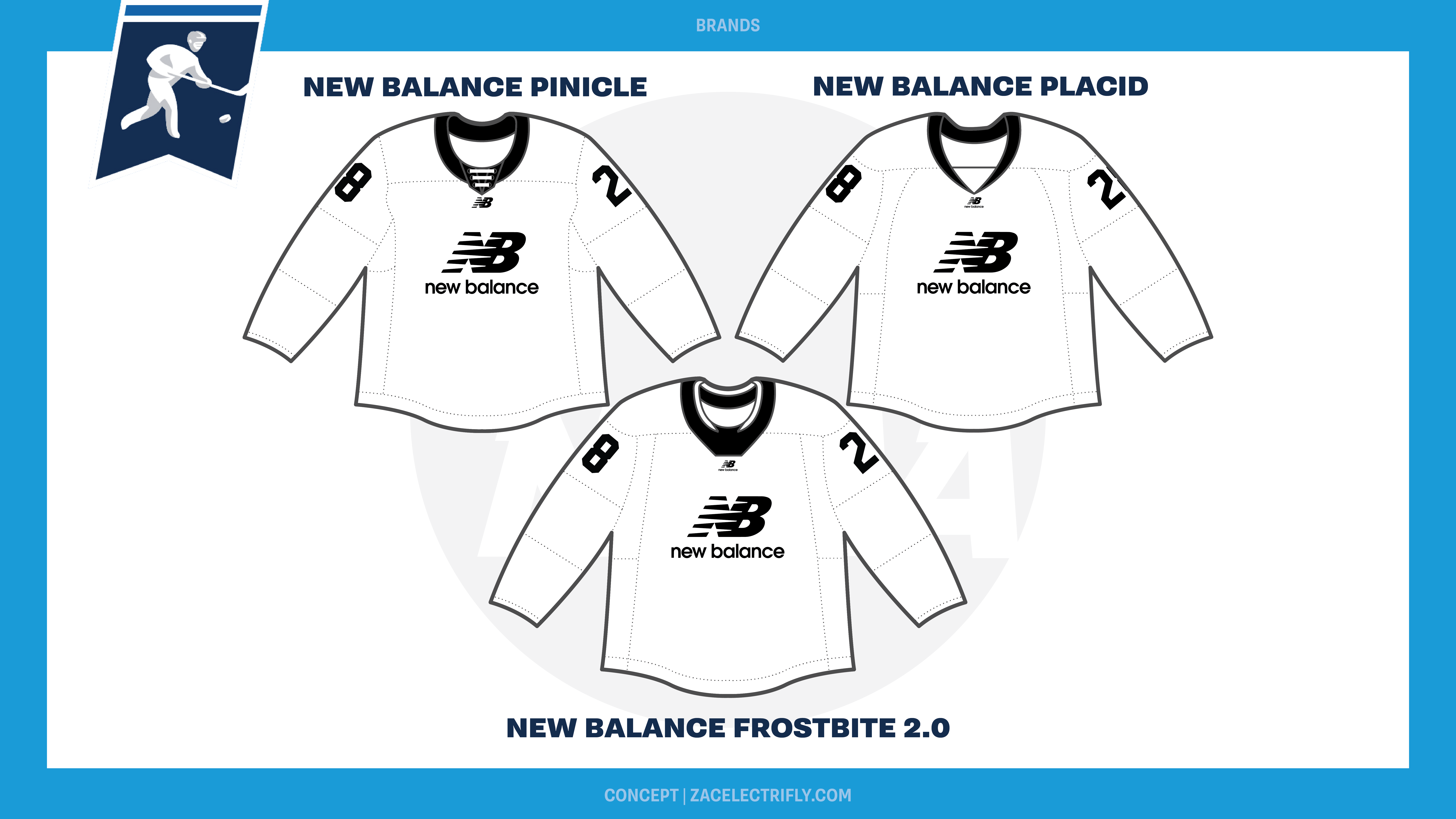 New Balance has three jersey templates. The Pinnacle template is based on the NCAA jersey template they used prior to 2023. The Placid jersey template is based on the 2008 to 2016 NHL jerseys. The Frostbite 2.0 template is based on their new NCAA template. Current NCAA division one hockey teams sponsored by New Balance will use either the Pinnacle or Frostbite 2.0 jerseys. New Balance Sponsored NCAA teams without NCAA division one ice hockey teams will use the Placid jerseys. New Balance teams will use Warrior hockey equipment since New Balance owns warrior.