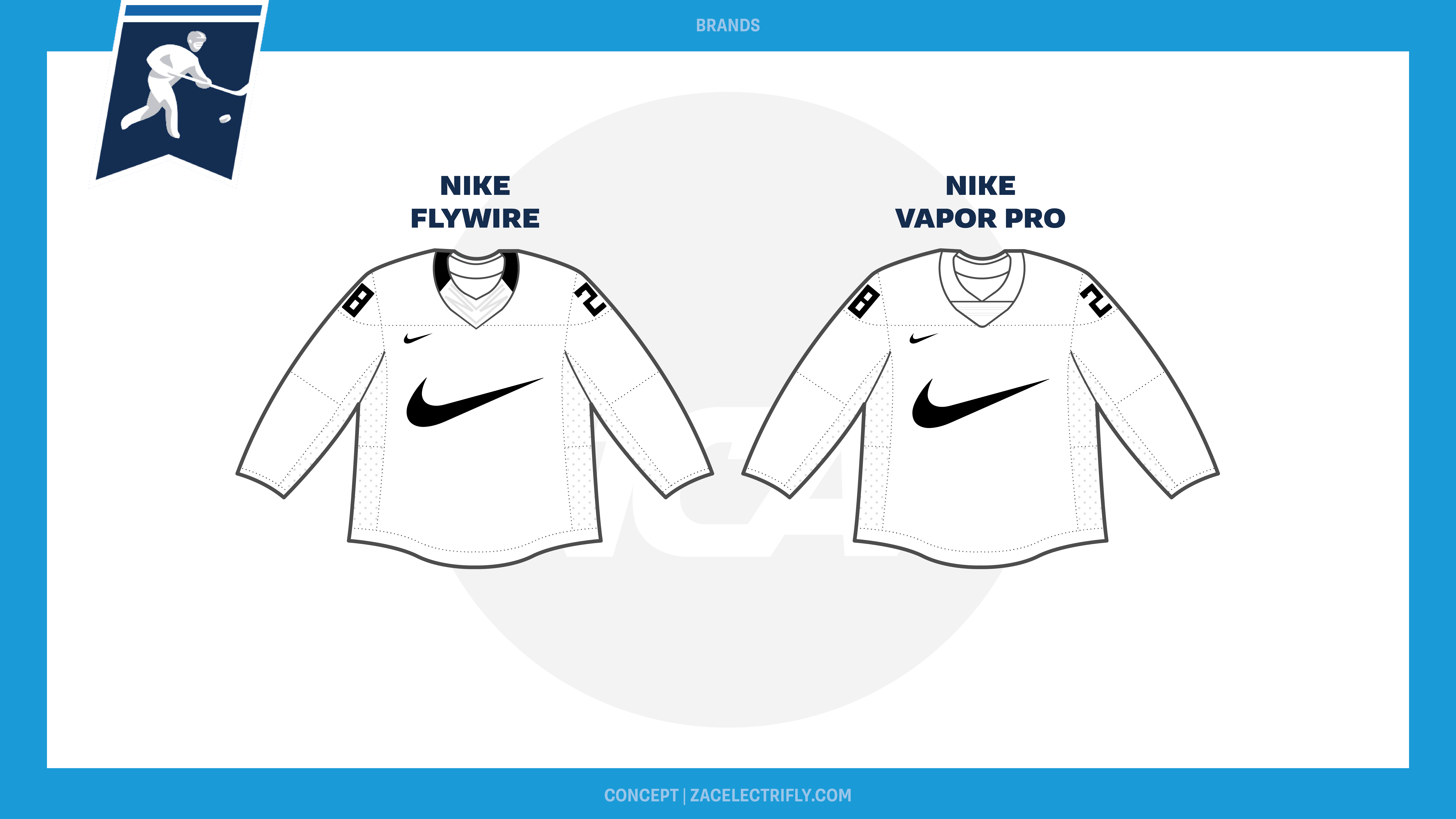 Nike has six templates. The Nike Recycled template is based on the 2018 winter olympic ice hockey jerseys. The Nike Dri Fit template is based on the 2022 winter olympic ice hockey jerseys. The Nike Flywire template is based on their old college and NFL template. The Nike Vapor Pro template is a combination of the Nike Dri Fit hockey jerseys and the Nike Vapor Untouchable football jerseys. The Nike Vapor FUSE jersey is a combination of the Nike Dri Fit hockey jerseys and Nike Vapor FUSE football jerseys. The Nike Vapor Varsity template is based on the Nike Authentic Hockey Jersey. The Nike Recycled and Dri Fit templates are used by current NCAA Division one ice hockey teams. The Nike Flywire, Nike Vapor Pro, and Nike Vapor FUSE are used by Nike sponsored schools based on which football jersey they use. The Nike Vapor Varsity template is used by Nike sponsored schools that do not have football teams. Nike sponsored teams use Bauer as their equipment provider. While Nike no longer owns Bauer they still have a strong relationship.