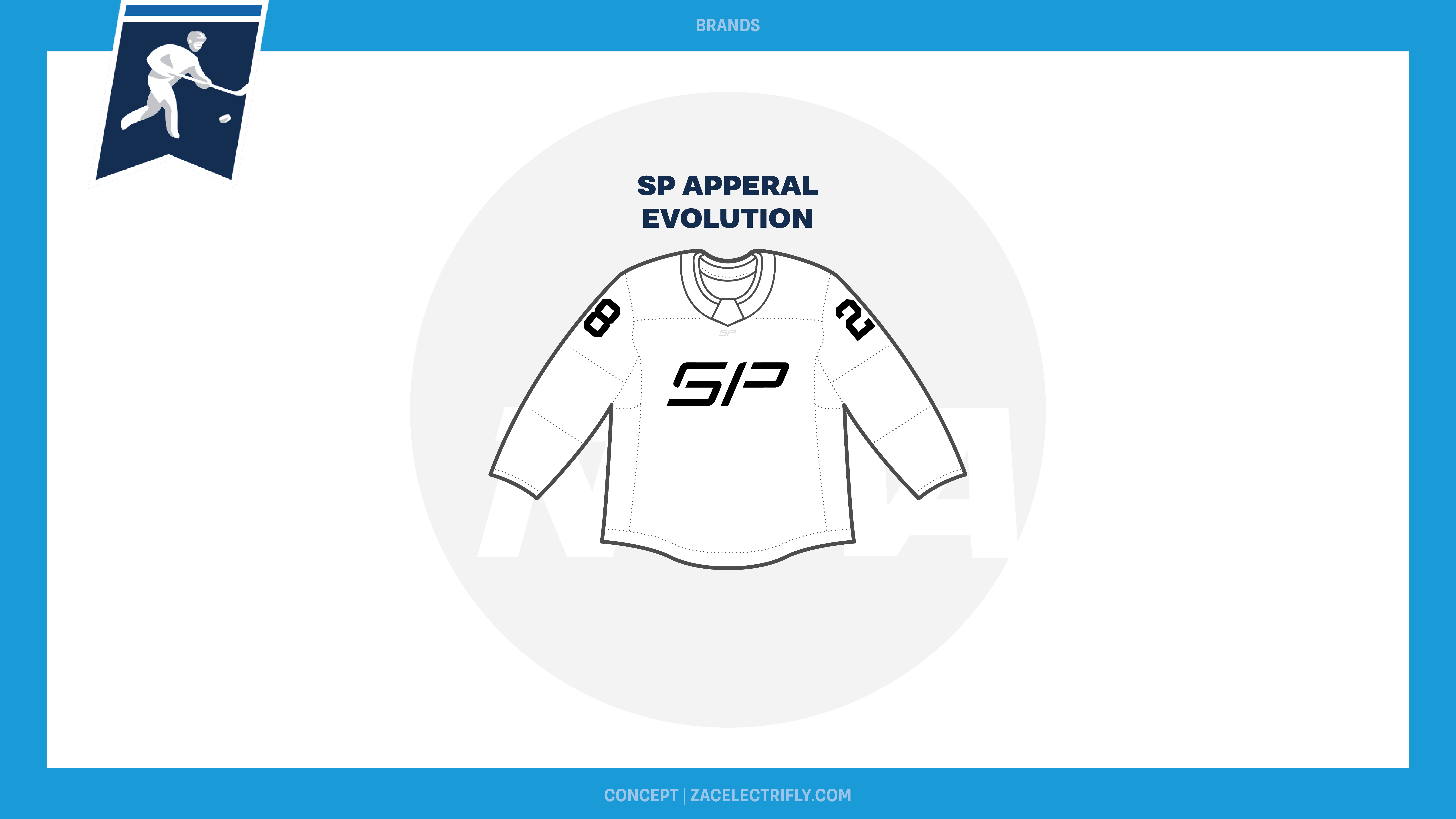 SP Apparel has one template. The SP Evolution template. It is based on the current NHL template. It will be used by current NCAA division one hockey teams that use SP jerseys. SP teams will use another company as an equipment provider.