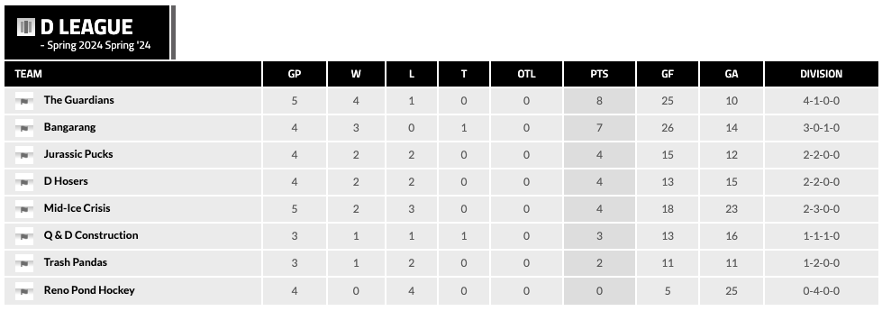 Bangarang now lead the D-League Power Rankings. They moved up after a win. Q & D Construction are in the second spot. They moved up after a win. Mid-Ice Crisis are in the third spot. They moved up after a win. The Guardians are in the fourth spot. They moved down after a loss. The Trash Pandas stayed in the fifth spot after not playing in week four. The Reno Fire Hosers D stayed in the sixth spot after a win. The Jurassic Pucks stayed in the seventh spot after a loss. Reno Pond Hockey stayed in the last spot after another two losses.