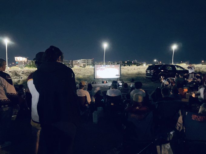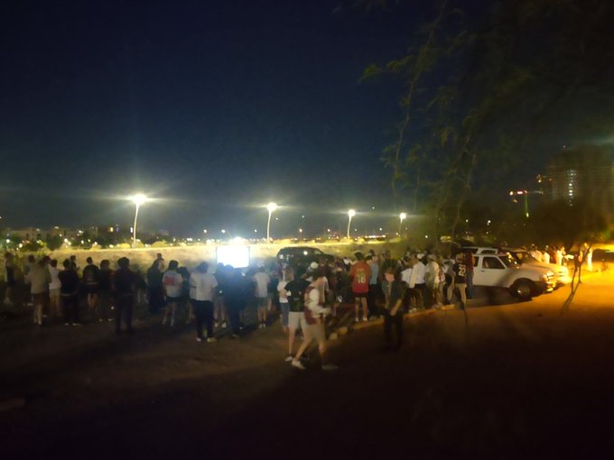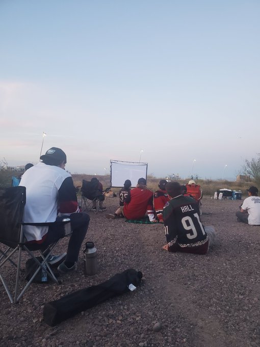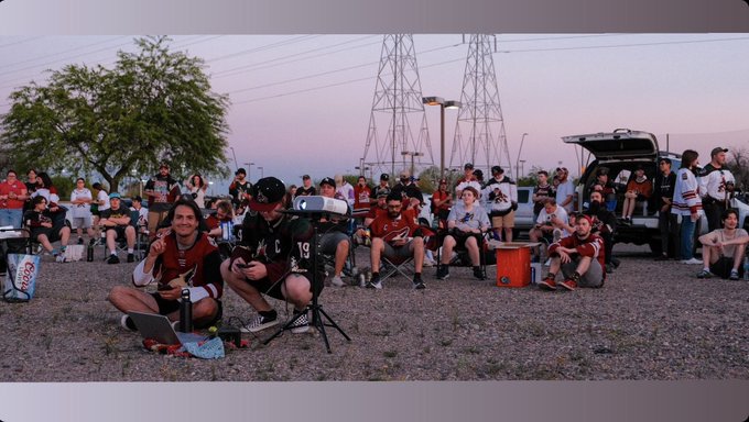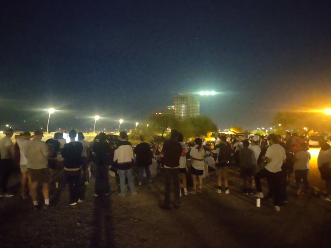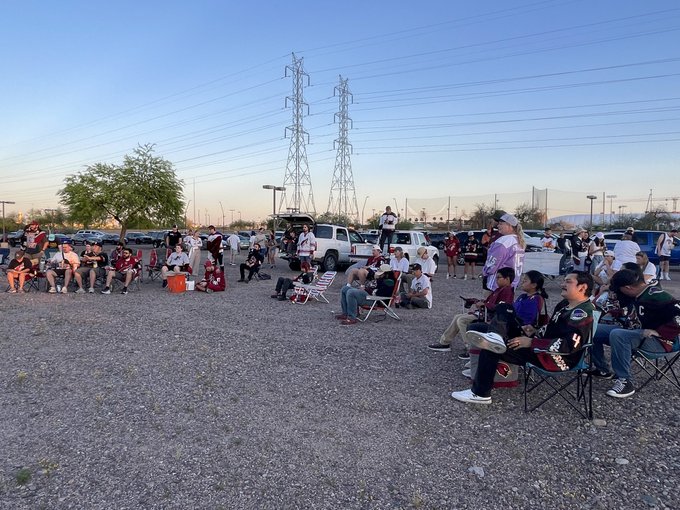 The first storyline going into the game was about the watch party. The cheapest tickets for the game were over five hundred dollars. Despite that the game still sold out. Fans who were unable to get in planned on gathering outside of the arena to watch the game. This is a common practice by fans in the NHL. Unfortunately the Arizona State University Police shut down a potential gathering outside. They moved the gathering to a dirt parking lot where a projector was set up so fans could watch the game. It looked like there was a couple of hundred people at the watch party. It was hard to tell how many people were there from the photos.