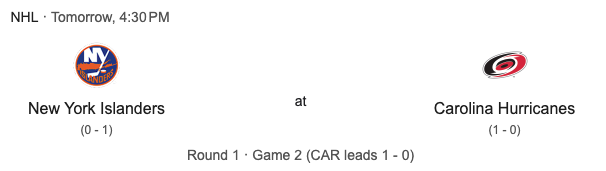 Game two of this series will be on Monday, April 23rd. Puck Drop is set for 4:30 PM. That game will be in Carolina.