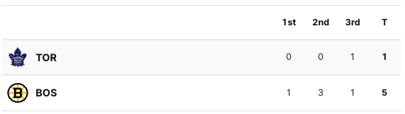 With eighteen minutes left in the game the Maple Leafs got on the board. #64 David Kampf scored the Maple Leafs first goal of the game. It was assisted by #24 Connor Dewar and #75 Ryan Reaves. With just over two minutes left in the game, the Bruins scored again. #11 Trent Frederic scored an empty net goal. #88 David Pastrnak got the assist. The final score was 5-1 Bruins. The Bruins unsurprisingly win game one and take a 1-0 series lead.