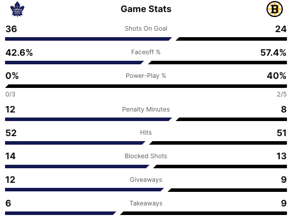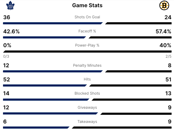 The Maple Leafs were not in this game for two periods. Once the Bruins were up by three goals, the Maple Leafs were not coming back. The Maple Leafs have to find a way to score. They outshot the Bruins by twelve shots. All those top offensive players and they could not find a way to score. The power play helped the Bruins a lot in this game. Those two extra power play goals really put the game out of the Maple Leafs reach. The Maple Leafs are still looking for their first win against the Bruins this season. The Bruins have won all five of their meetings so far.