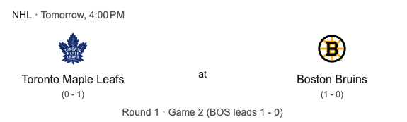 Game tow of this series will be on Monday, April 22nd. Puck drop is set for 4:00 PM. The game will be in Boston.