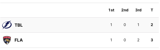 Neither team scored in the second period. The game would stay tied at 1-1 heading into the third period. Less than a minute into the third period the Panther regained the lead on a powerplay goal from #23 Carter Verhaeghe. #16 Aleksander Barkov got his second assist of the game on this goal. #19 Matthew Tkachuk also go an assist on this goal. The Panthers took a two goal lead with just over two minutes to go in the game. #19 Matthew Tkachuk scored the goal. #5 Aaron Ekblad got the assist. With ten seconds to go in the game the Lightning scored to bring the game back within one goal. #91 Steven Stamkos scored the powerplay goal. #86 Nikita Kucherov and #21 Brayden point got the assists. The final score was 3-2 Panthers. The Panthers won the opening game of this series and now have a 1-0 series lead.