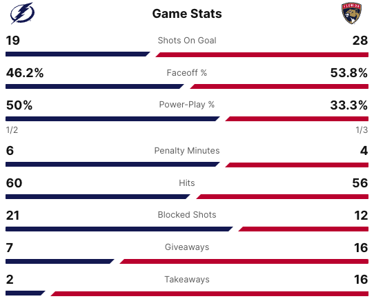 For most of the first and third periods the Panthers were in control of the game. The Lightning were trailing for most of the game. That is not a position they want to be in. The Lightning did not let the Panthers run away with the game. It was close. It could have gone either way. The Panthers took advantage on the powerplay early in the third period which is what gave them the edge to win the game.