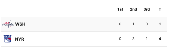 #20 Chris Kreider scored the only goal in the third period. His goal put the Rangers back up by three goals. That goal was assisted by #93 Mika Zibanejad and #96 Jack Roslovic. The final score was 4-1 Rangers. The Rangers now have a 1-0 series lead.