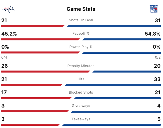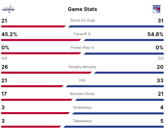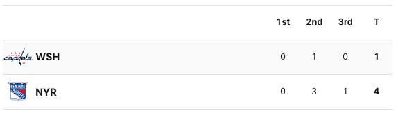 Five minutes into the second period the Rangers opened up the scoring with a goal from #73 Matt Rempe. It was assisted by #26 Jimmy Vesey and #21 Barclay Goodrow. Thirty seconds later the #10 Artemi Panarin scored to give the Rangers a two goal lead. That goal was assisted by #16 Vincent Trocheck and #13 Alexis Lafrenière. About two minutes later #26 Jimmy Vesey scored for the Rangers to put them up 3-0. #21 Barclay Goodrow got his second assist of the game on that goal. About a minute after the Rangers third goal, the Capitals scored. #42 Martin Fehervary scored the goal. #43 Tom Wilson and #21 Aliaksei Protas got the assists. The second period ended with the Rangers up 3-1.