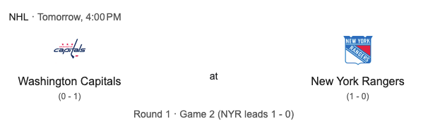 Game tow of this series will be on Tuesday, April 23rd. Puck drop is set for 4:00 PM. The game will be in New York.