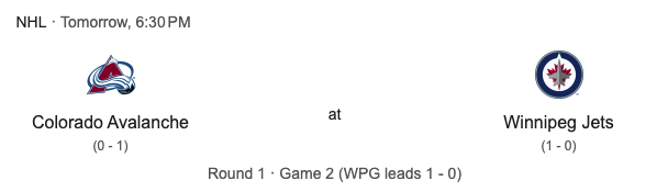 Game two of this series will be on Tuesday, April 24th. Puck Drop is set for 6:30 PM. That game will be in Winnipeg.