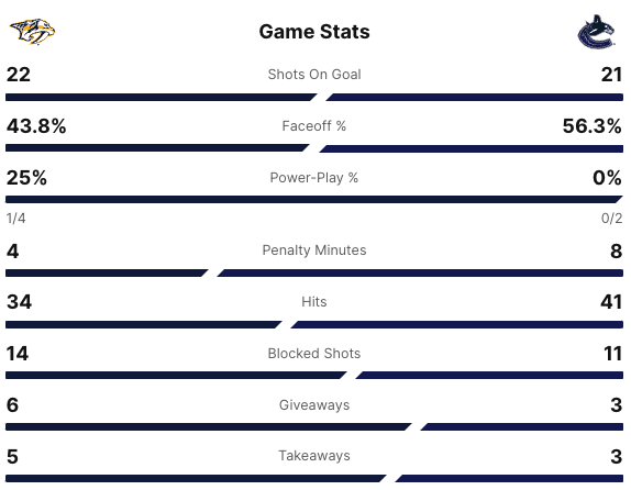 The Canucks stepped up in the third period to get the win. This was a pretty even game. If this is an indicator for the rest of the series it will be a close one. The Canucks scored three unanswered goals to win this game. The Predators will not find success in the playoffs if they allow teams to do that. The Canucks offensive power was on display in the third period. They showed that they can score quickly and when they need to.