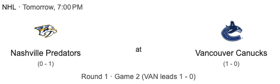 Game tow of this series will be on Tuesday, April 23rd. Puck drop is set for 7:00 PM. The game will be in Vancouver.
