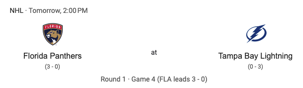 Game four of this series will be on Saturday, April 27th. Puck Drop is set for 2:00 PM. That game will be in Tampa Bay.