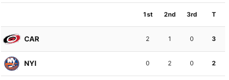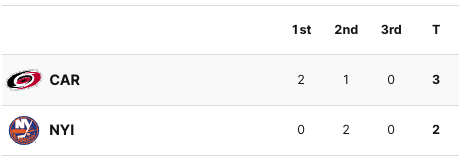 Neither team scored in the third period. The Hurricanes held onto their lead. The final score was 3-2 Hurricanes. The Carolina Hurricanes now have a 3-0 series lead.