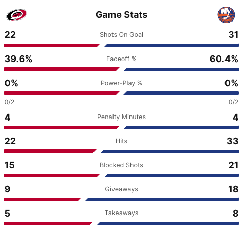 Three minutes into the second period, #18 Pierre Engvall scored for the Islanders. His goal was assisted by #27 Anders Lee and #3 Adam Pelech. With tweleve minutes left in the second period, #20 Sebastian Aho scored for the Hurricanes to retake the two goal lead. His goal was assisted by #37 Andrei Svechnikov and #5 Jalen Chatfield. With just over two minutes to go in the second period, #29 Brock Nelson scored for the Islanders. His goal brought the lead back down to one goal. It was assisted by #21 Kyle Palmieri and #6 Ryan Pulock. The score was 3-2 Hurricanes heading into the third period.