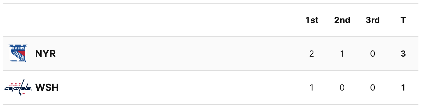 Neither team scored in the third period. The final score was 3-1 Rangers. The New York Rangers now have a 3-0 series lead.