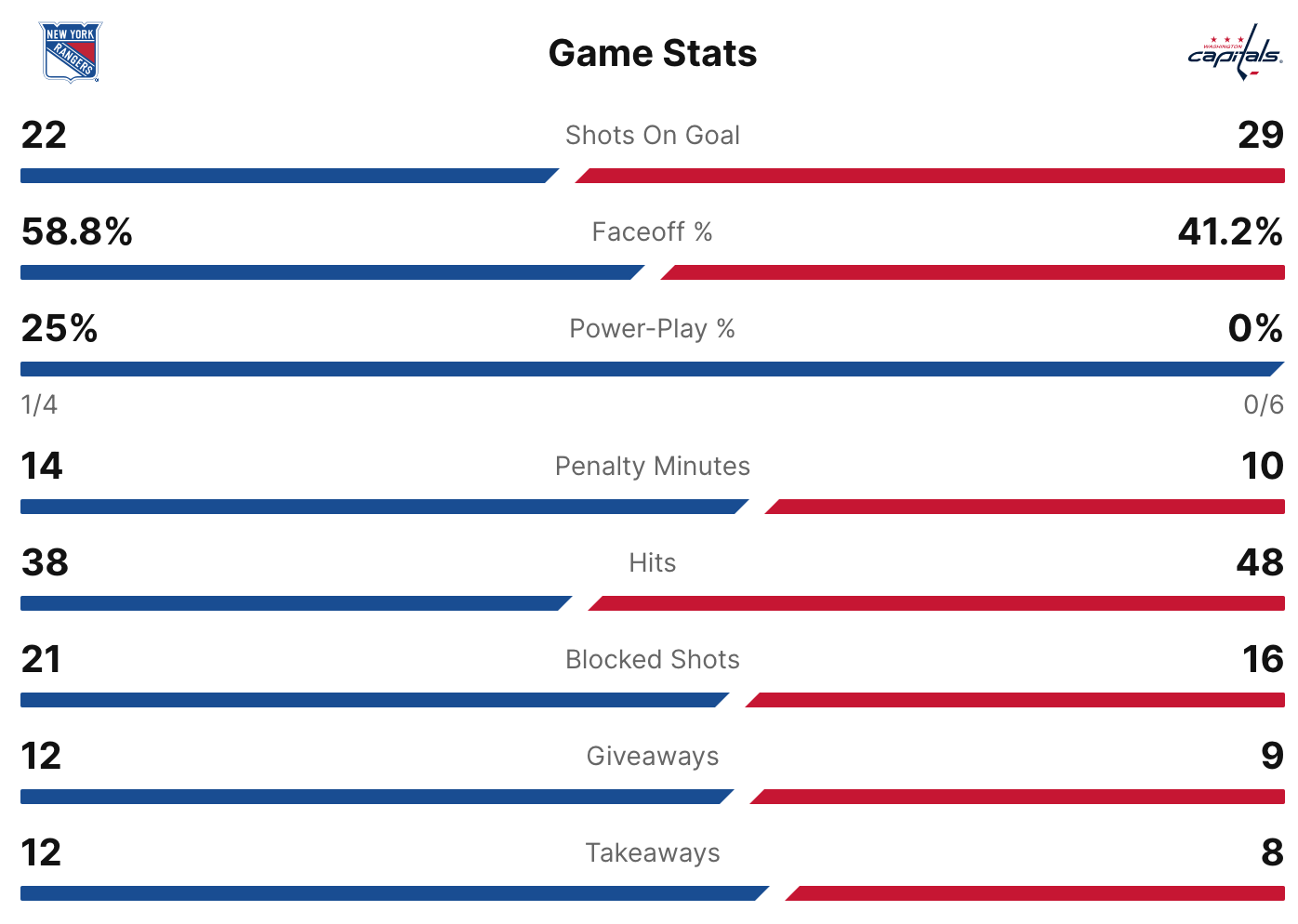 The Rangers held onto their two goal lead to win this one. The Capitals now face elimination. The Rangers have positioned themselves to get a sweep. The Rangers are not dominating this series. The Rangers are playing good hockey and are not giving up their leads. The Capitals not playing on the same level. The effort the Capitals are giving is not where it needs to be to be competitive in this series. Thats whats going to be remembered about this series. The Rangers right now are taking advantage of a team who is not putting in the effort to reach the other teams level.