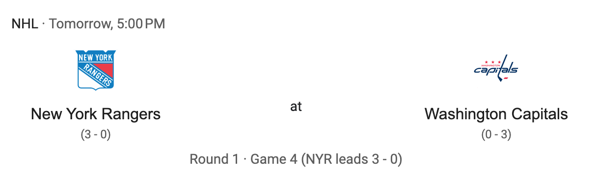 Game four of this series will be on Sunday, April 28th. Puck Drop is set for 5:00 PM. That game will be in Washington.